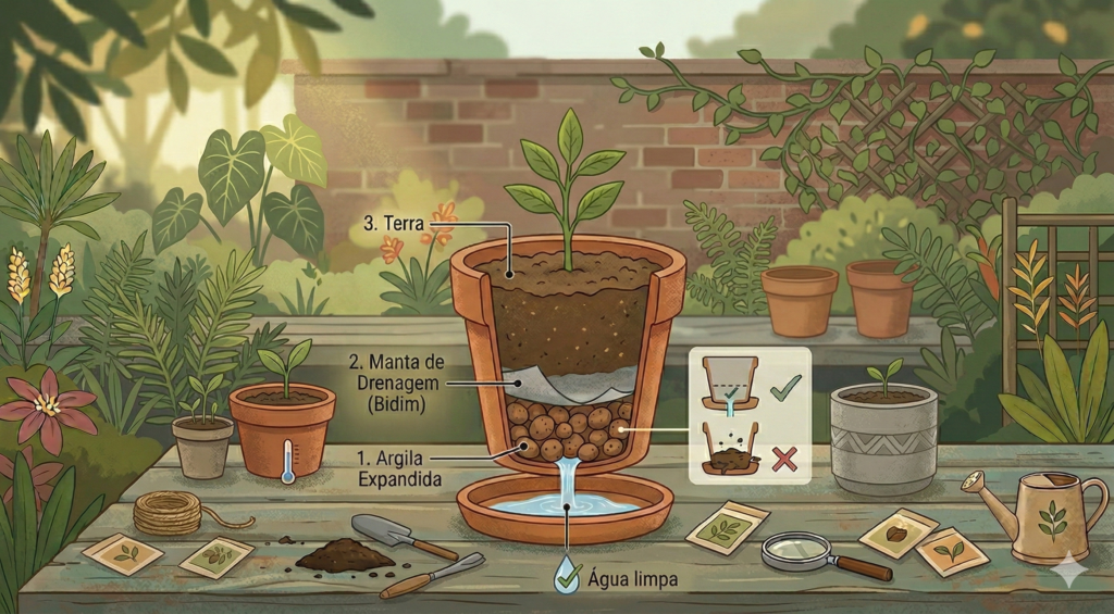 O segredo está na montagem da drenagem. Faça uma camada de argila expandida no fundo do vaso e cubra com uma manta de drenagem (bidim) antes de colocar a terra. Isso garante que a água escorra limpinha.